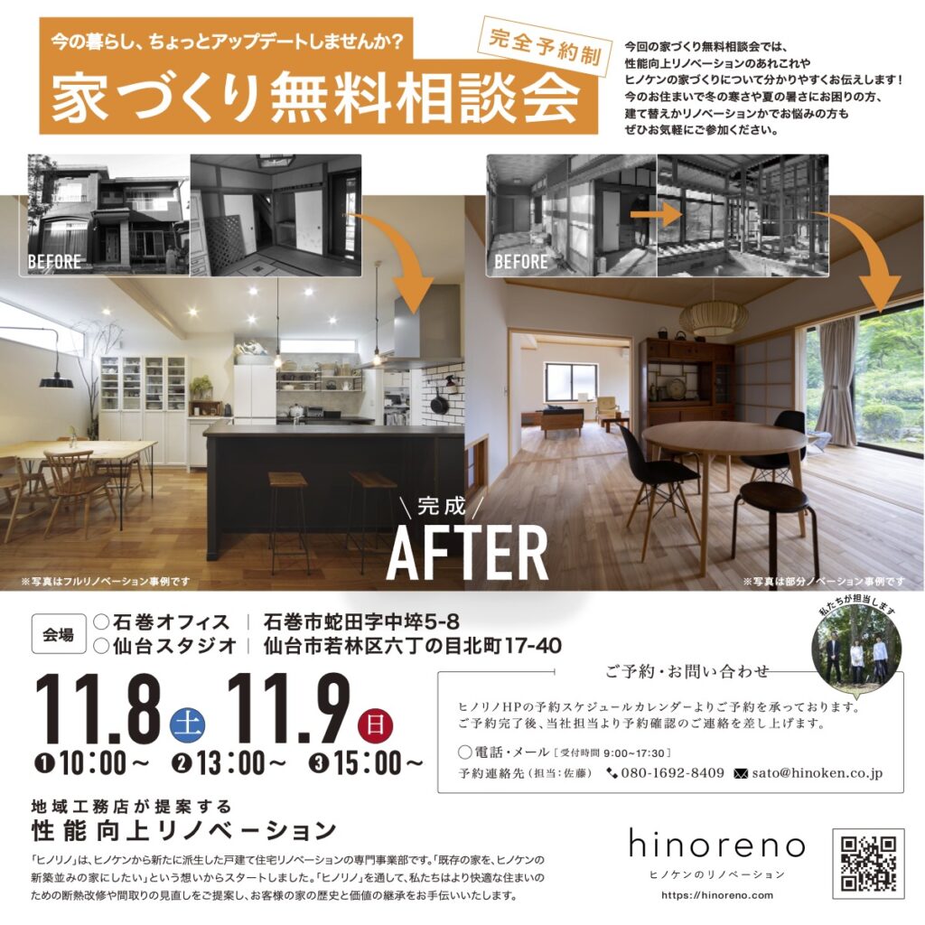 ヒノケンのリノベーション専門事業「ヒノリノ」では、今ある住まいの性能やデザインをアップデートし、快適で長く住み続けられる家づくりをサポートしています。11月の無料相談会では、断熱改修や間取り変更、サウナ・趣味室などのプラスαのご提案まで、具体的な事例を交えてわかりやすくご紹介します。